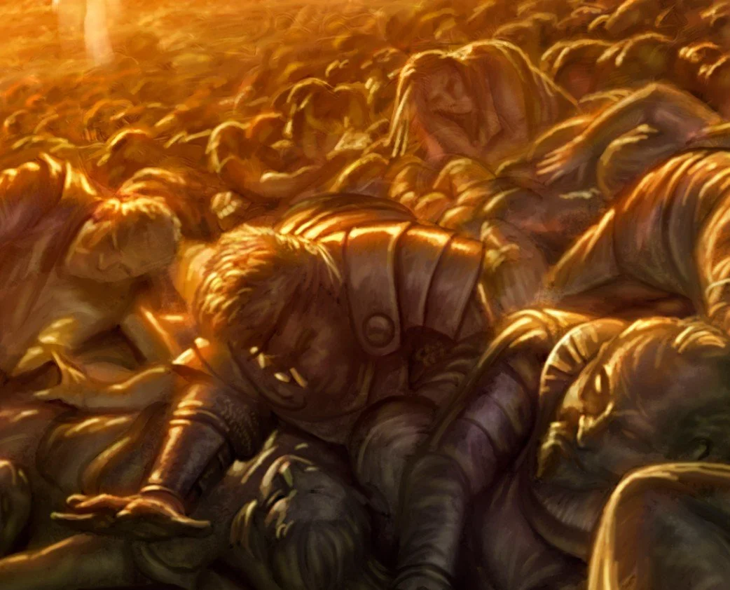 This painting shows the in-between plane of Asphodel Meadows, a place where a person’s physical form at the time of death is represented by a statue and from that statue a great wind carries their souls into the roaring blaze of eternity. Some (lucky?) few with the gift of their mystical powers can fight against these winds of fate, as we see.